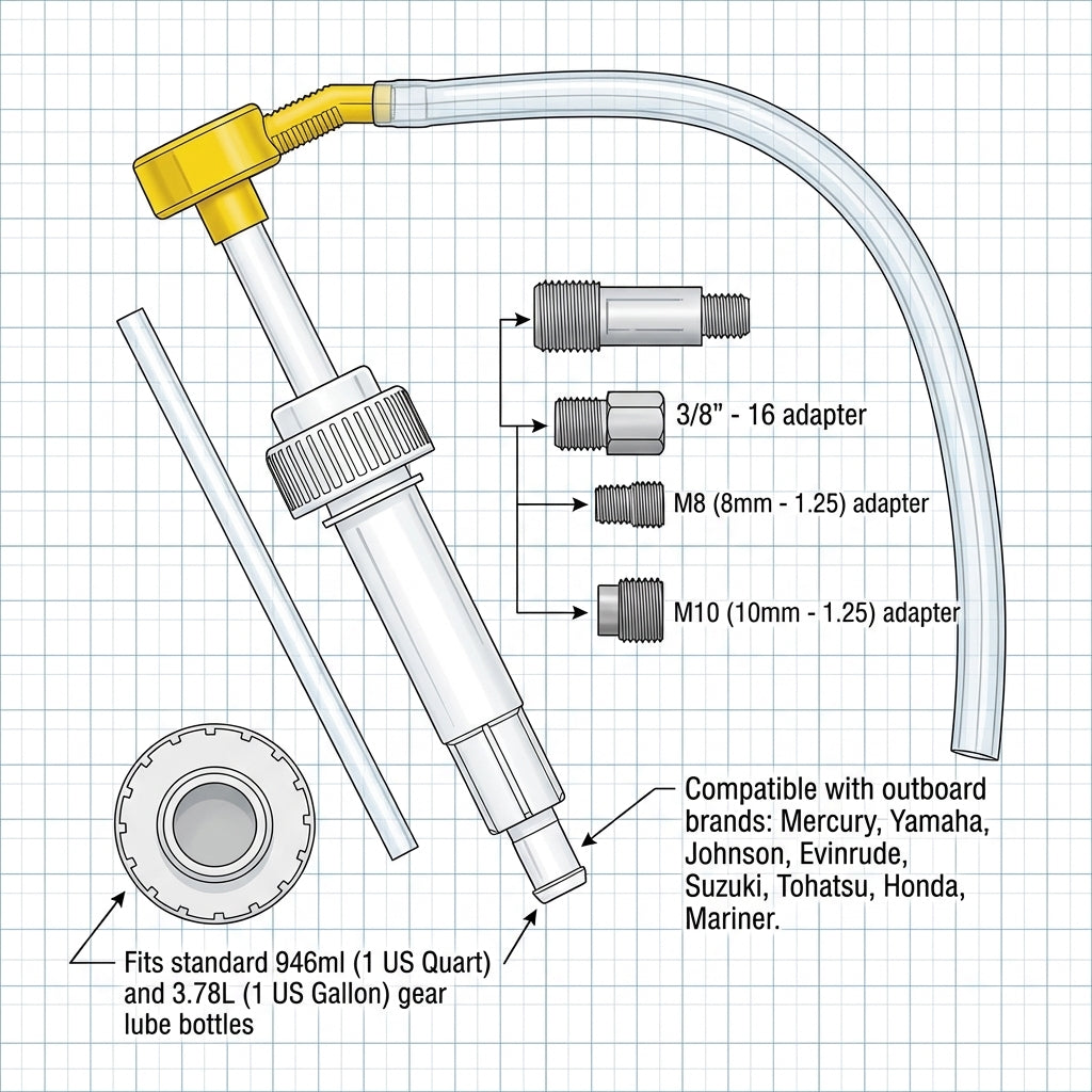 Yamaha outboards standardly use an M8 (8mm) thread for the lower unit fill plug. This kit includes the specific M8 adapter required for a secure, leak-free connection during the filling process.