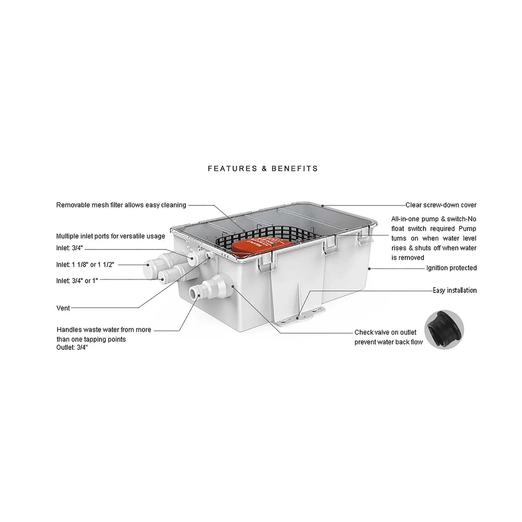 Compact 24 V sump pump system for shower and greywater use, delivering 2,271 LPH (600 GPH) with an integrated automatic float switch.